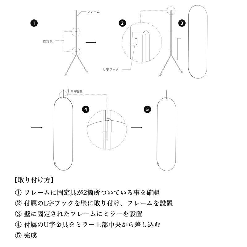 最小限のパーツで構成されるムーべウォールミラーの取り付け方は非常に簡単です。