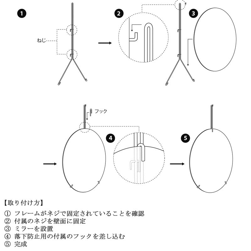 ポスターフレーム同様、縁のない丸い鏡と壁に固定するフレーム、フレームを壁に取り付けるためのネジのみで完結するミニマルデザインのウォールミラーです。